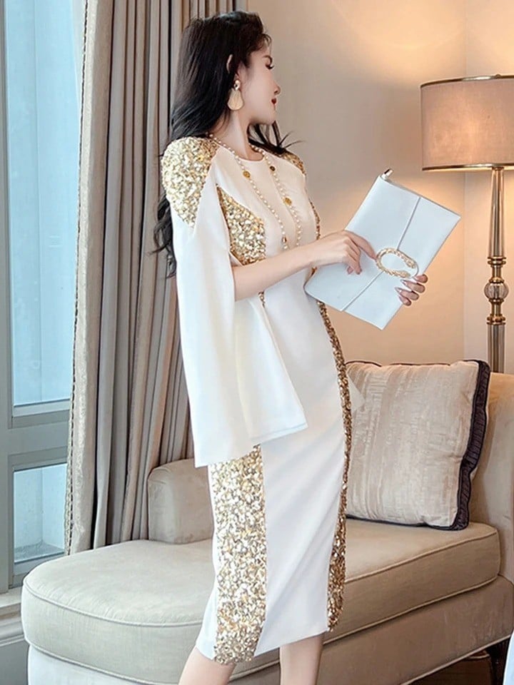 فستان سهرة نحيف مع ترتر ذهبي للنساء ، فستان رائع للمضيف والولائم ، فستان منفوش ، نمط فاخر ، فستان أبيض للإناث ، حفلة موسيقية ، 2023