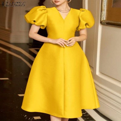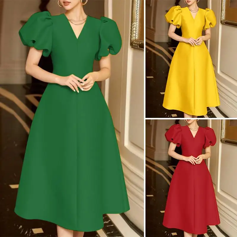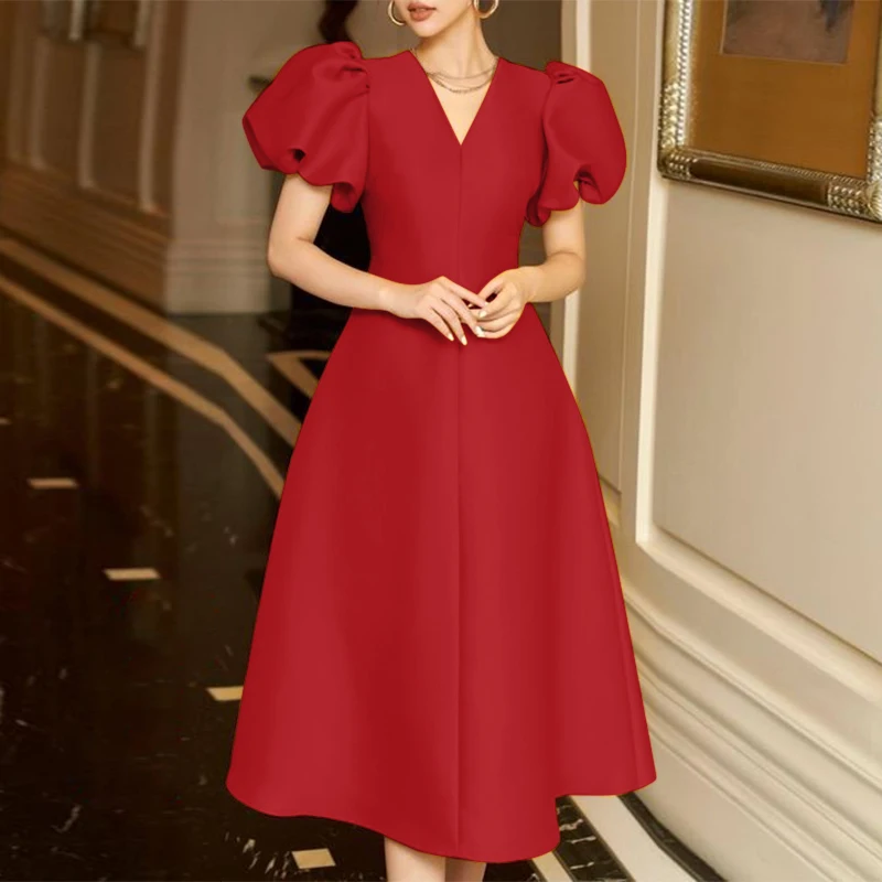 فستان شمسي نسائي بأكمام منفوخة على شكل حرف V ، كلاسيكي على شكل سطر ، كبير الحجم ، أحادي اللون ، فستان حفلات أنيق ، موضة صيفية ،