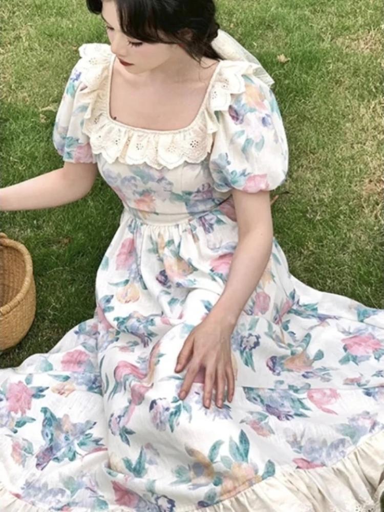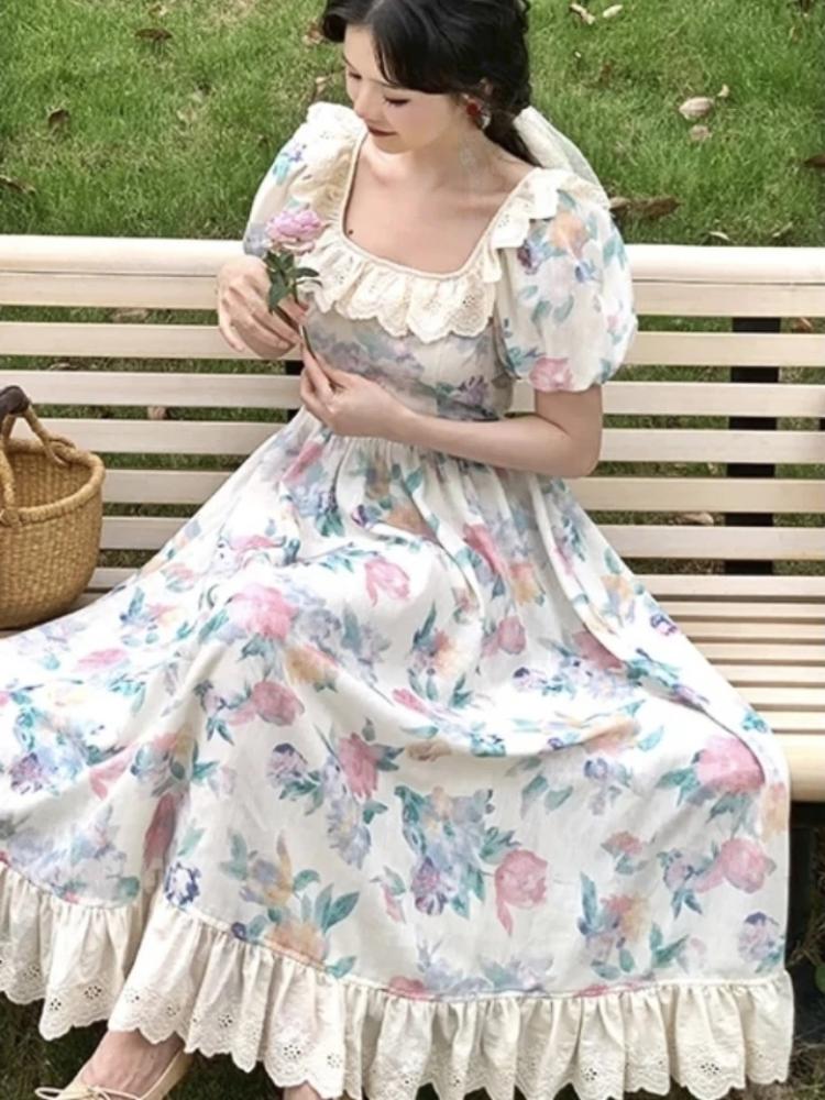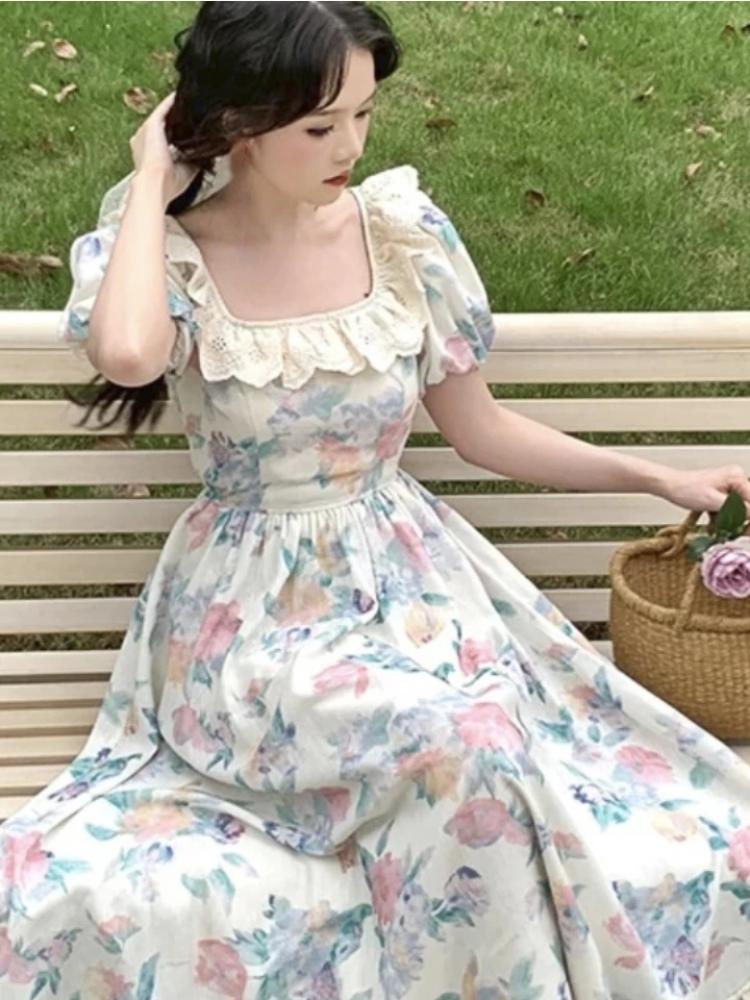 فستان فرنسا الحلو المطبوع بالازهار فستان عتيق للنساء فستان ميدي مكشكش للنساء موضة كورية أنيقة فستان الحفلات 2023