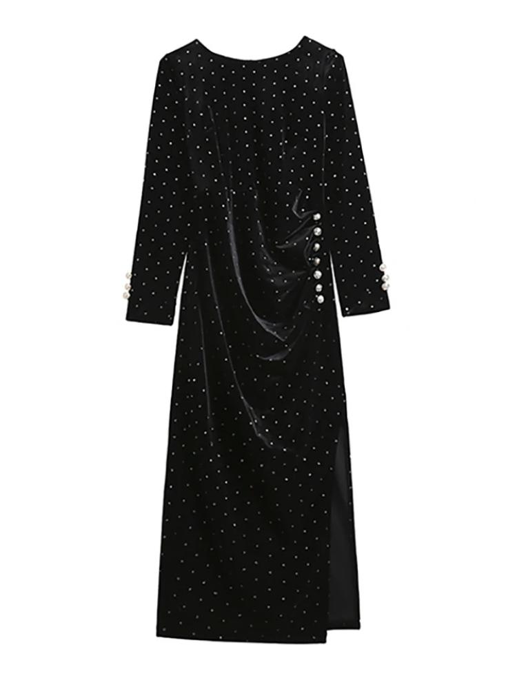 فستان نسائي أسود مخملي بنقط البولكا ، حفلة مسائية ، أنيق ، ألماس ، أنيق ، فاخر ، أزياء المشاهير ، خريف ، شتاء ،